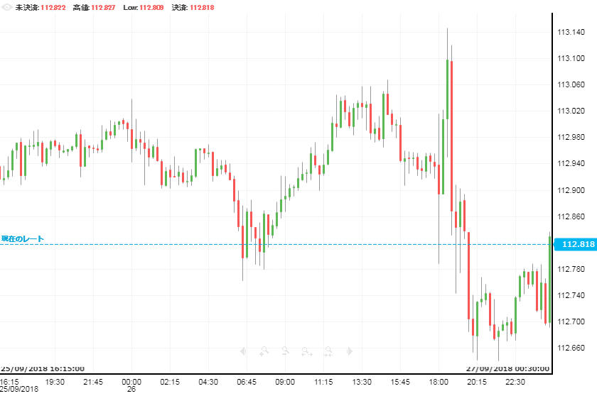 政策金利発表前となった26日の米ドル/円は、日中から夜まで112円台後半で横ばい。そして27日の午前3時に政策金利が発表され、すでに述べたように0.25%の利上げだった。利上げが行われたことで一瞬113円台をつけたが、同時に発表された声明では来年以降の利上げペースが減速するという内容だったためにその後下落。112円60銭付近まで落ちるなど、政策金利発表後に乱高下が見られた。