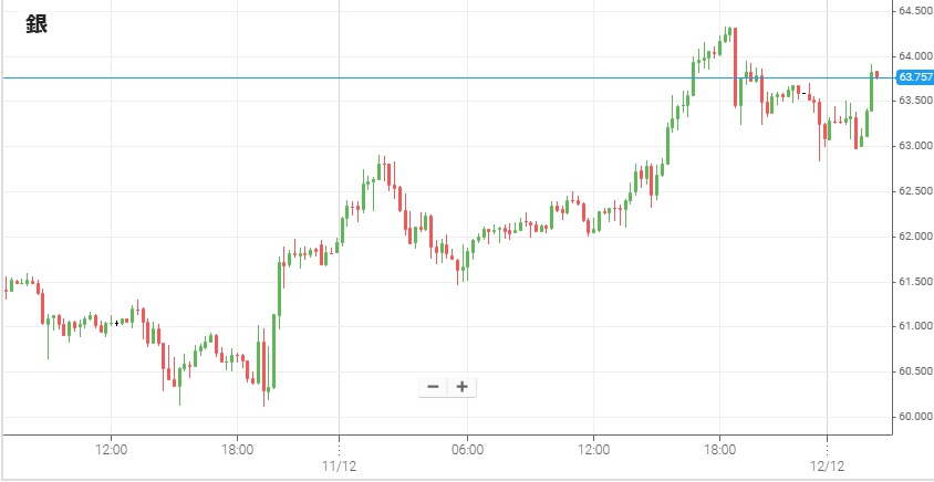 金価格の最高値更新が続いており、同時に同じ貴金属銘柄の銀も最近になって高騰。今週の9・10日と連日で史上最高値を更新した。11日朝方に62ドル付近だったNY銀は、日中は大きく動かずそのまま62ドルを挟んで上下。だが夜になると再度買いが増えて上昇し、12日未明には64ドルを超えて3日連続で最高値更新となった。