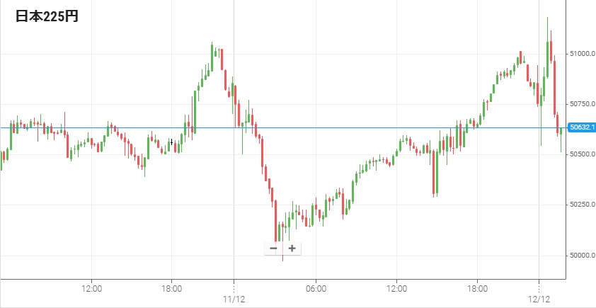 東京株式市場開始前の午前4時に米政策金利が発表され、予想通りの0.25%利下げだったが同時に短期債の購入が発表されたことなどを好感しNY株式市場は上昇した。その流れからこの日の日経225平均は216円高の50,818円で寄り付いたものの、前日と同様に高値を維持することはできず前場に50,300円台まで下落。昼休み中に先物が売られたことで後場開始直後には50,000円を割ったが、そこで下げ止まりその後は反発して終値は454円安の50,148円だった。