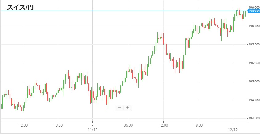 スイス中銀が11日午後5時半に政策金利を発表し、大方の予想通り0%のまま据え置きだった。フラン高を止めるためにマイナス金利にするという予想もあったが、同時に発表された声明で「米関税引き下げのためスイス経済の見通しはやや上向いた」との文言があり米関税引き下げが据え置き決定要因と見られる。11日朝方に1フラン=194円台後半にあったスイスフラン/円だが、この日が日中から円安・フラン高が進行。金利据え置きが発表された後もフラン高は止まらず、12日早朝には196円に接近して最高値を更新した。