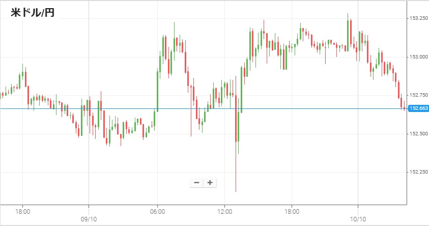 すでに述べたように高市新総裁の政策が今後の財政赤字拡大につながるとの懸念が高まり、総裁就任後の今週になって為替市場では急激な円安が進行している。9日朝方には1ドル=152円台後半だったレートは、午後になって上昇し153円を突破。その後調整で152円台まで後退した後、午後10時頃から高市総裁がテレビに出演して円安をけん制する発言を行った。この発言で152円付近まで円高になったが一時的な動きで終わり、すぐに円安に戻り10日未明は主に153円台に留まった。