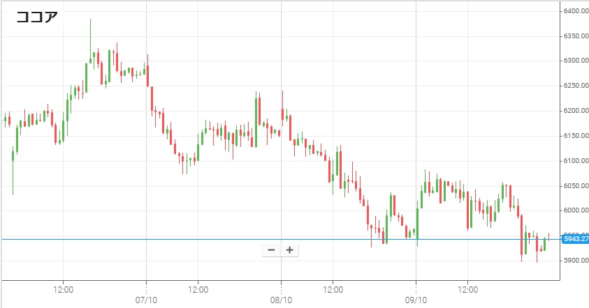 昨年から今年前半は暴騰していたココア価格だが、8月下旬頃からは一貫して下落。また最近になって西アフリカの生産国であるガーナとコートジボワールで、政府がカカオ豆農家に対する補助金を増額すると発表。これがココアの新たな売り材料となっている。8日を5,950ドル付近で終えたNYココアは、9日の市場前半には上昇して6,000ドルを回復したものの後半に下落。一時は5,900ドルをつけて昨年2月以来1年8ヶ月ぶりの安値を連日更新した。