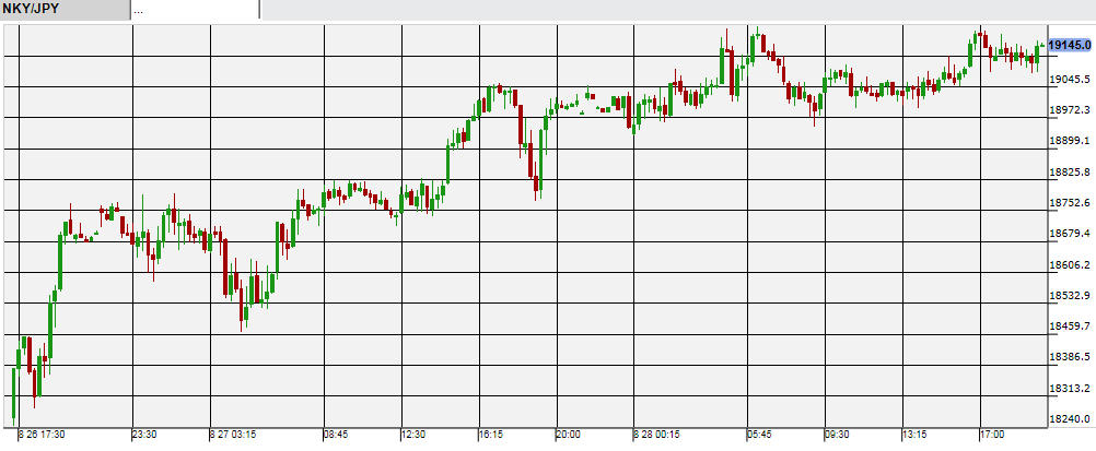 国内株式市場でも先週前半までの暴落からのリバウンド相場が続いた。前日のNY株式市場の上昇を受け、金曜の日経225平均は18,908円と前日よりも300円以上高くスタート。その直後に19,000円台を回復し、それからは終始19,000円台で推移したまま、561円高の19,136円で終了した。夕方以降の先物の時間にはあまり動かず、29日朝まで19,100円前後の小動きだった。