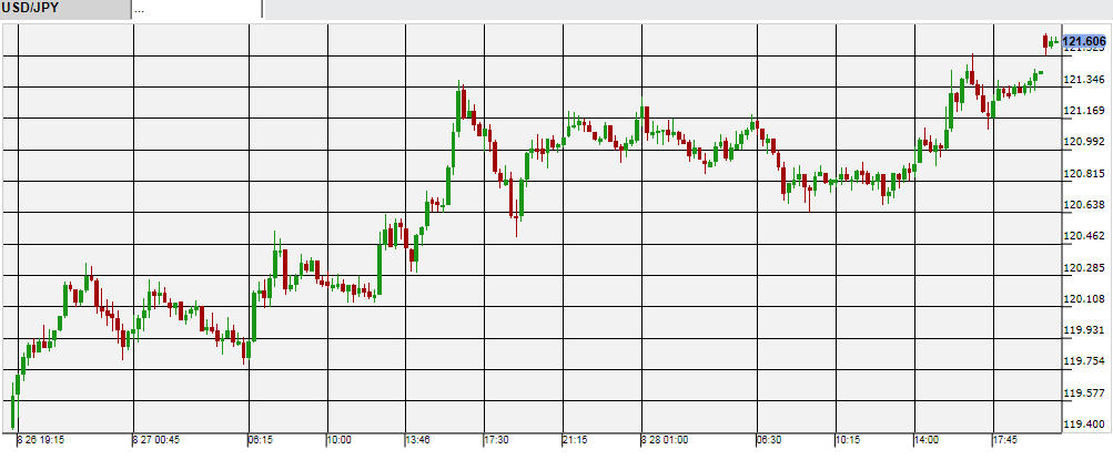 世界同時株安の流れから先週月曜に一時115円台まで暴落した米ドル/円だが、その後はまた円安に向かっていた。そして28日金曜には、121円台を中心にあまり動かないままだった。この日は米経済指標がいくつか発表され、例えば8月ミシガン大学消費者態度指数は予想の93.0に対して発表は91.9とやや悪かったが、米ドル安にはならなかった。