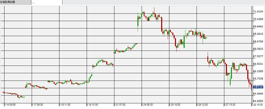 原油安とともに通貨・ルーブルの下落が続いていたロシアだが、先週木~金2日間の原油の大幅リバウンドを受け、ルーブルも同様に上昇。特に金曜の上げ幅が大きく、前日の1米ドル=69ルーブル台から一気に65ルーブル台になった。先週前半までルーブルの下落が続き去年12月の通貨危機再来のリスクがあったが、これで一旦は落ち着いた。
