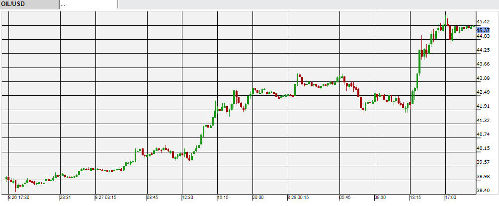 27日木曜に原油が大きく上昇して42ドル台まで到達していたが、金曜には続伸。45ドル台まで上昇し、ここ半月ほどの下げ幅を2日間で帳消しにした。これで27・28日の2日間で、上昇幅は17%にもなった。ここまで上昇した背景には、株安が止まったことによる中国需要増観測、米第2四半期GDPが改定値で上方修正されたことによる米需要増観測などがある。