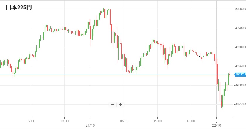 高市政権が成立するとの期待から前日・20日は大幅上昇した日経225平均は、21日は490円高の49,675円からスタート。前場は政権への期待から一段高となり、一時は49,945円の最高値をつけて50,000円まであとわずかに迫った。そして後場開始後に高市氏が総理に選出されたものの、材料出尽くし感からその後は下落。一時は前日終値を割って131円高の49,316円で終了した。