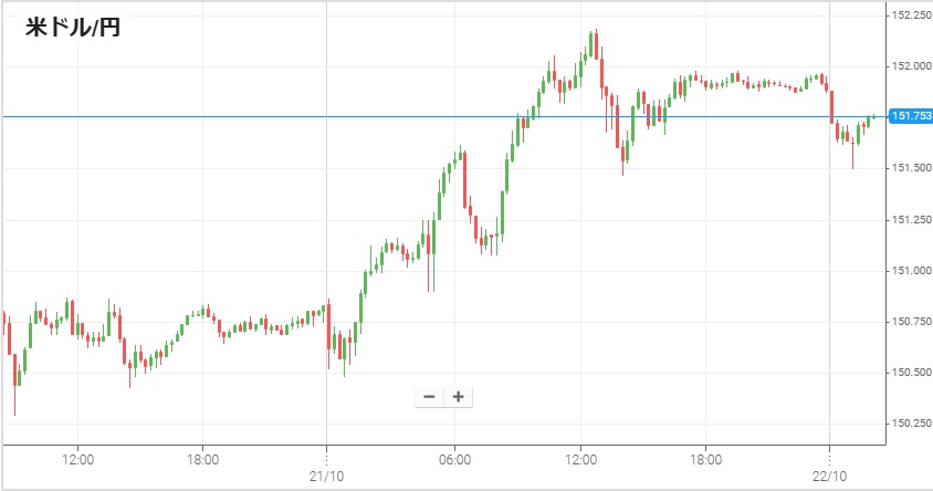 米ドル/円は21日朝方には1ドル=150円70銭付近にあったが、高市総理が選出される見通しから首相指名選挙前の午前中から円安が進行して選挙開始前には151円になった。そして午後1時すぎには選挙の結果が確定し、高市氏が総理に選出された。高市氏の政策は今後の財政懸念を高めるものが多いため、選出後は円安が進行。夜には152円台をつけたがそこで円安は一旦止まり、22日未明は主に151円台後半で推移した。