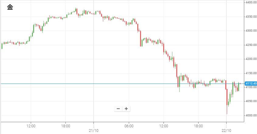 9月からの約1ヶ月半で急上昇してきた金価格だが、ここに来てついに大幅調整が入った。21日未明には4,380ドルまで上昇して最高値を更新したNY金は、午前中から緩やかに下落。午後になると利益確定売りが増えて下げが加速し、夜には一時4,100ドルを割った。22日は4,100ドルよりやや高い水準で推移した後、午前9時頃には4,000ドル近くまで急落。直近24時間の下落率は5%を超えた。