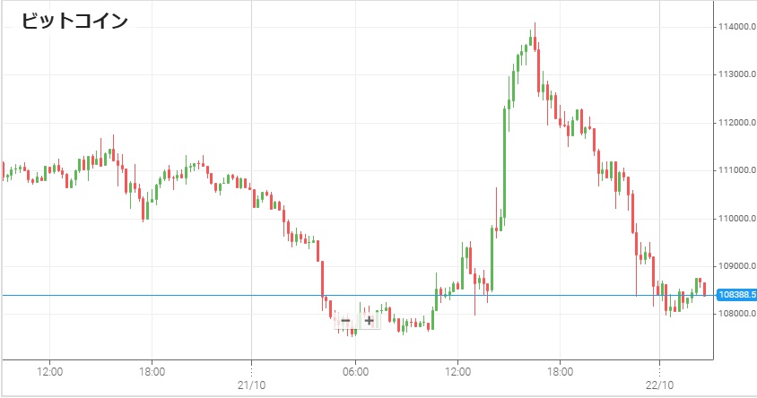 21日朝方に1,630万円だったビットコインは、午前中に30万円ほど下落。午後から夕方にかけて緩やかに反発した後、午後11時頃から2~3時間急上昇して1,730万円をつけた。この動きは金価格の下落のため、逃避資産買いの動きがビットコインの方に流れたのではないかとの見方がある。だがその後は急反落して22日朝方までに元の水準に戻る荒い値動きだった。(注:チャートは米ドル表記です)